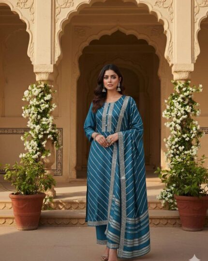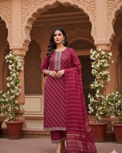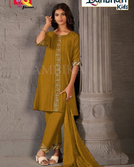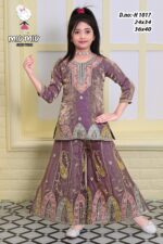 Introducing the stunning Miu Miu Girls Wear Sharara Set – Design H1017, a perfect blend of traditional beauty and modern elegance. Crafted from premium silk-blend fabric with a luxurious metallic purple finish, this outfit is designed to make your little girl stand out at every event. The kurti features intricate embroidery, shimmering sequence detailing, and a beautifully embellished neckline that adds a festive charm. The matching flared sharara enhances the outfit with its graceful fall and coordinated multicolor motifs in pink, green, silver, and yellow. Comfortable to wear and visually striking, this ethnic set is ideal for weddings, family gatherings, festivals, birthdays, and photoshoots. With its premium craftsmanship and timeless style, this outfit is a perfect addition to every girl’s festive wardrobe.
