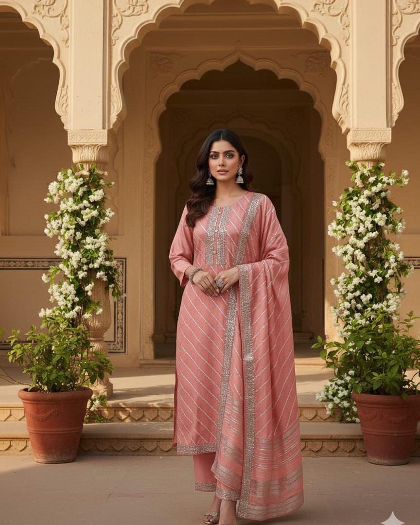 Elegant blush pink 3-piece ethnic suit set featuring intricate zari and sequin detailing, paired with a beautifully striped dupatta. Ideal for festive celebrations, wedding events, and traditional occasions.